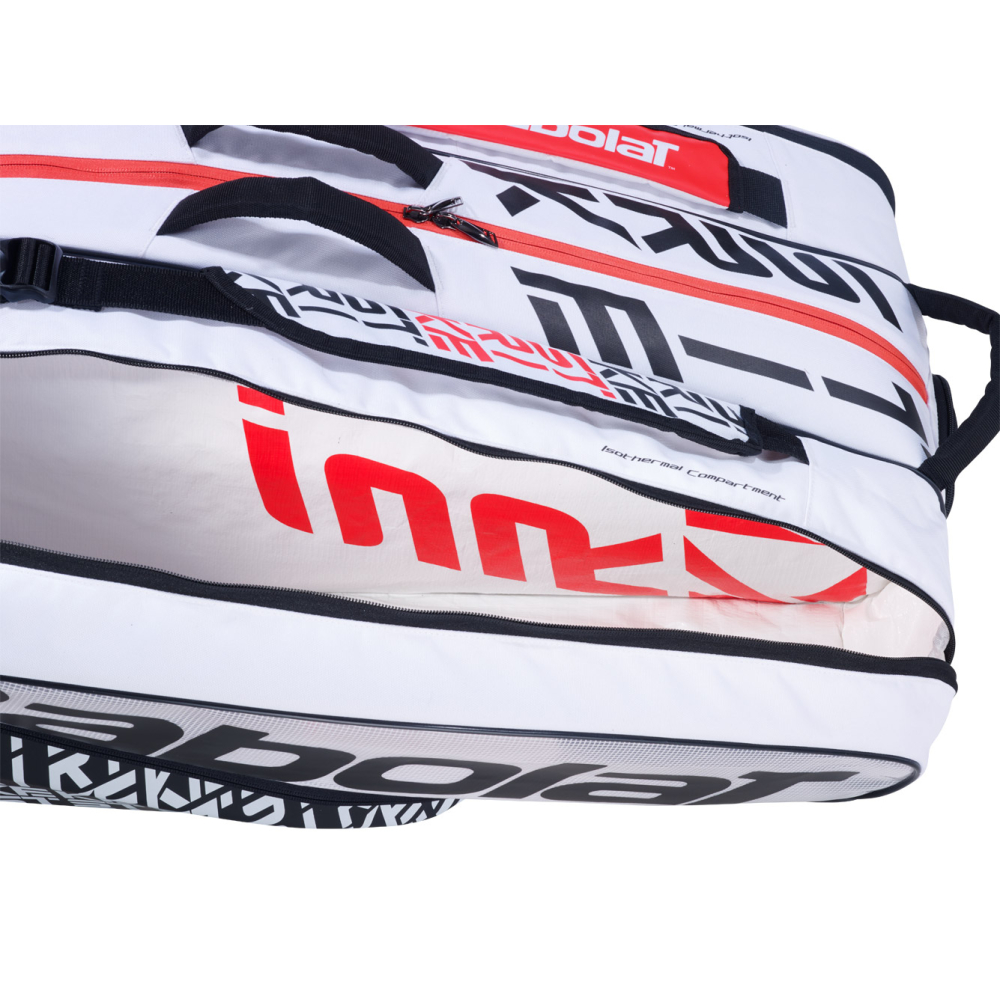 Чохол RH X12 PURE STRIKE від компанії Babolat – це преміальна модель для зберігання тенісних ракеток. Його великі розміри дозволяють вмістити до 12 ракеток, що робить його ідеальним вибором для професійних і аматорських гравців. Два термоізольовані відділення допомагають зберігати оптимальну температуру екіпірування, що зменшує втрату натягу струн. Виділяється ще відділенням з прозорим "віконцем", через яке можна побачити улюблену ракетку, а також окремими відсіками для аксесуарів і взуття. Комфортне транспортування забезпечують м'які ергономічні ручки і регульована лямка.