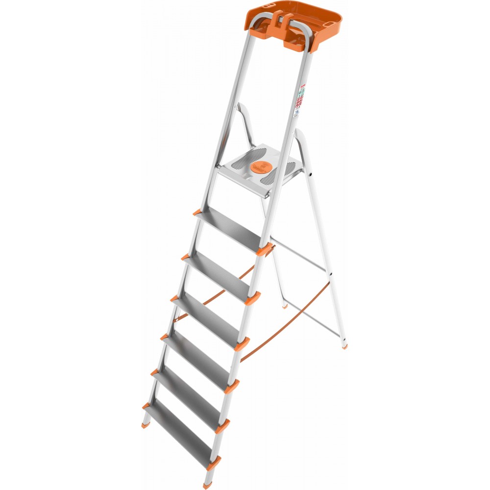 Легкі сходи Colombo Attica на 7 сходинок (S108A07P) - це абсолютно алюмінієві сходи, що відповідають стандарту EN131. Максимальна вага, яку може витримати цей виріб, становить 150 кг. Разом зі сходами поставляється міцний лоток для інструментів, що дозволяє закріпити та зберігати потрібні на висоті інструменти вагою до 5 кг, забезпечуючи комфортну роботу. Ширина алюмінієвих сходинок становить 8 см, а рифлена поверхня робить підйом та спуск безпечним, запобігаючи ковзанню. Захисний механізм унеможливлює випадкове складання під час експлуатації, а компактний дизайн робить їх зручними для зберігання, займаючи мінімально можливий простір.