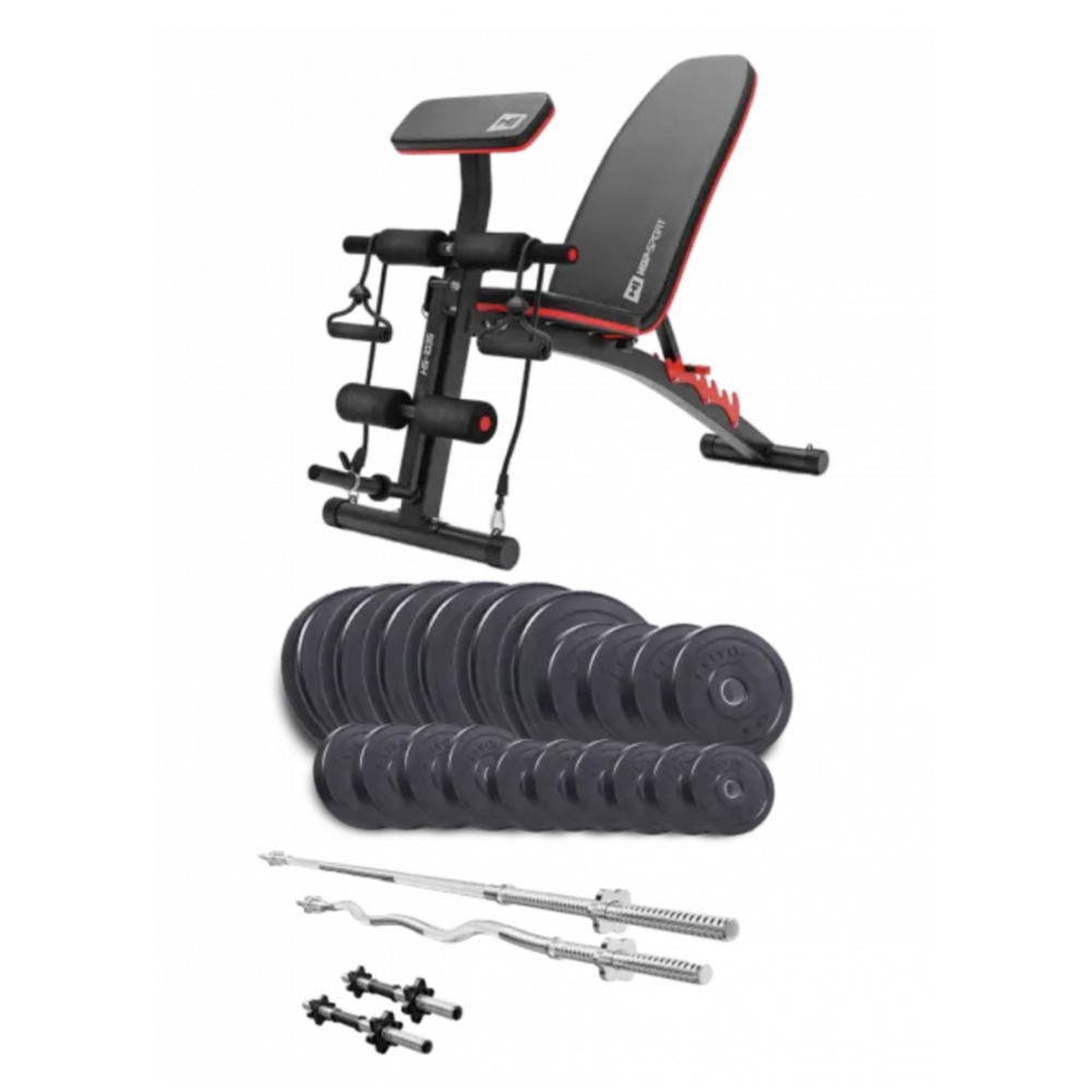 2 штанги, 2 гантелі та лава