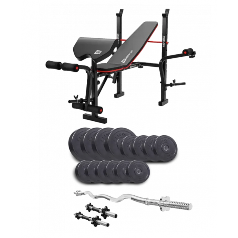А для зручного виконання силових вправ у набір входить тренувальна лавка HS-1055 Pro. Вона має стійки для штанги, поворотні важелі, парту Скотта і фіксатор для ніг. Конструкція виготовлена зі сталі, що гарантує її міцність і довговічність. Сидіння і спинка заповнені піноматеріалом і покриті ПВХ, що забезпечує комфорт і приємність виконання вправ.