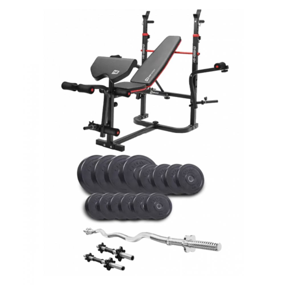 Основне супроводжуюче устаткування в наборі - це тренувальна лавка HS-1065HB Pro. Лавка виготовлена з високоякісних матеріалів і забезпечує безпеку, комфорт і довговічність під час тренувань. Регульований кут нахилу спинки дозволяє виконувати різноманітні вправи для зміцнення м'язів. Завдяки стійкам, штанга легко фіксується після тренування.