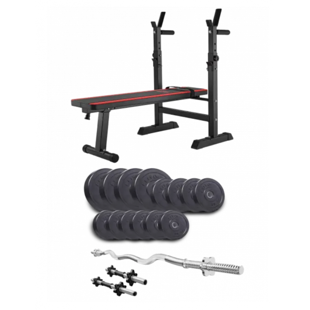 Склад набору включає диски, покриті ABS-пластиком, W-подібний гриф, два гантельних грифи і тренувальну лавку HS-1080. Ці деталі відрізняються високою якістю виготовлення і довговічністю, що забезпечує комфортні, безпечні і естетичні тренування. Диски з пластиковим покриттям не лише точно вимірюються і легко зберігаються, але і не гримлять під час виконання вправ, що дозволяє вам концентруватися на тренуванні.