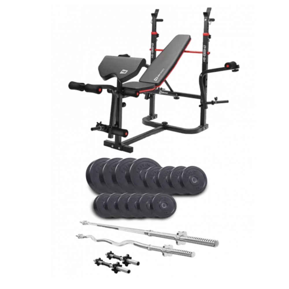 Особливу увагу в наборі заслуговує тренувальна лавка HS-1065HB Pro. Вона виготовлена з високоякісних матеріалів і оснащена регульованим нахилом спинки, що дозволяє виконувати різноманітні вправи на зміцнення різних груп м'язів. Крім того, вона має стійки, які допомагають зафіксувати штангу після тренування. Лавка також оснащена тягами для рук і ніг, що розширює її функціональність.