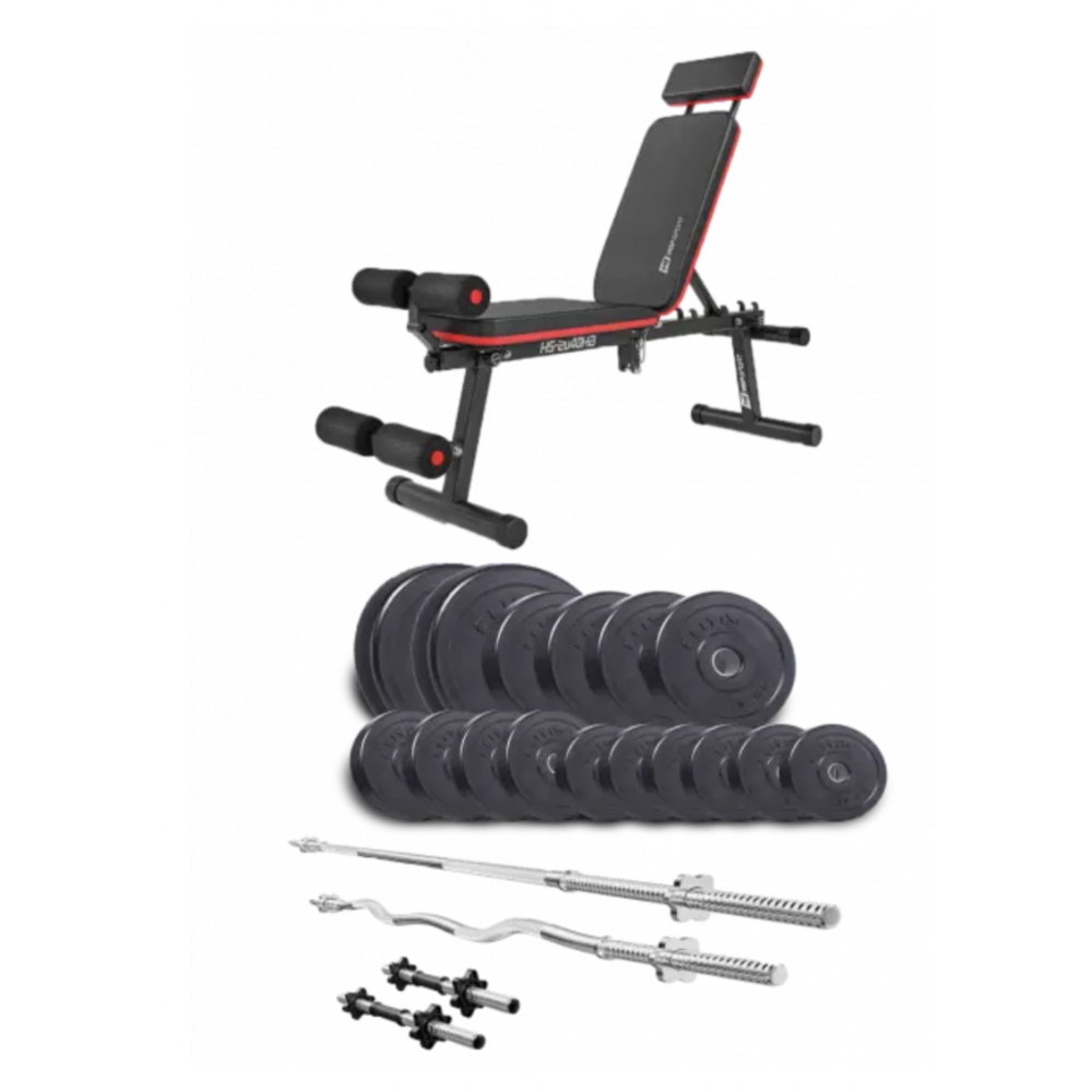 2 штанги, 2 гантелі та лава