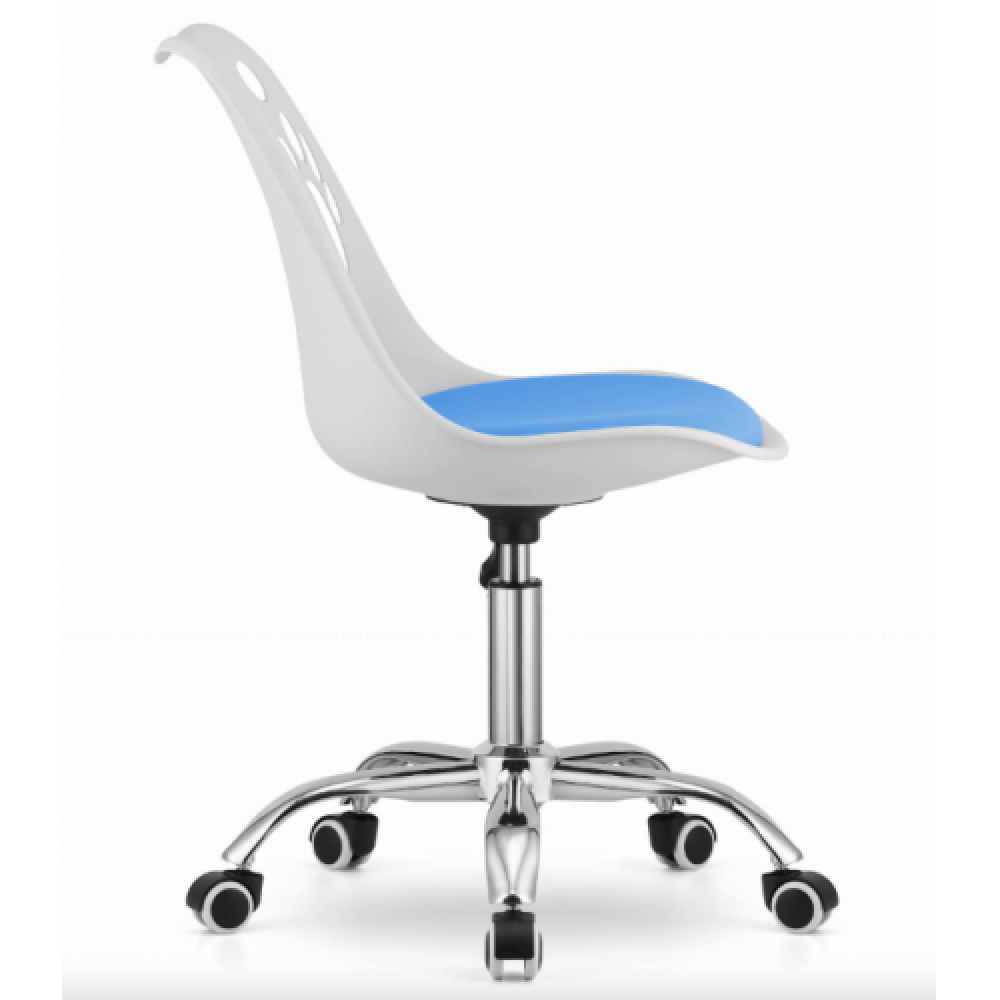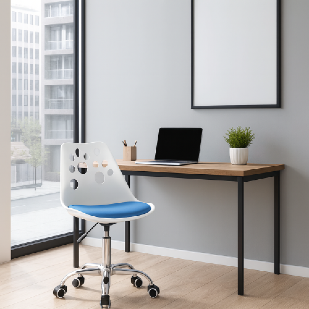 Офісне крісло Print поєднує сучасний мінімалістичний дизайн, ергономіку та щоденний комфорт. Воно добре підходить для домашнього кабінету, офісу або дитячої кімнати, легко вписується в сучасний інтерєр і не перевантажує простір завдяки компактним габаритам. М’яка подушка з екошкіри робить посадку приємною під час тривалої роботи або навчання, а міцна хромована основа забезпечує стабільність і довговічність.