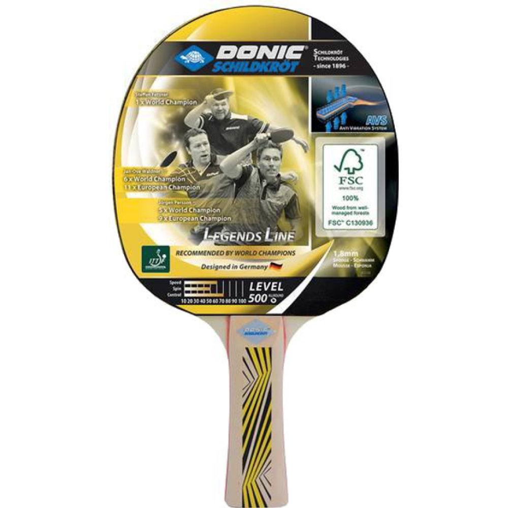 Ракетка для настільного тенісу Donic Legends 500 FSC, виготовлена компанією Donic-Schildkröt, є чудовим вибором для початківців. Це доступна модель у популярній серії ракеток. Завдяки якісній деревині та високому рівню зчеплення, схвалене ITTF елітне гумове покриття («пупи всередині») від Schildkröt забезпечує хороше зчеплення навіть для перших ігор з обертанням. Губка товщиною 1,8 мм, розташована між поверхнею та деревиною, додає потужність при збереженні хорошого контролю. Інтегрована антивібраційна система (AVS) між лезом та рукояткою значно знижує вібрації та коливання, що сприяє зменшенню втоми та забезпечує чудовий контроль.