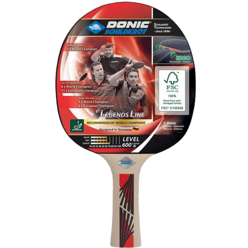 Ракетка для настільного тенісу Donic Legends 600 FSC від Donic-Schildkröt - якісна модель у своїй лінійці, яка задає тренди. Ідеальний вибір для любителів активного відпочинку і шкільних спортивних занять. Legends 600 FSC - це відмінний варіант для амбітних спортсменів-аматорів і відданих гравців-любителів, поєднує якісну деревину і зручні ручки. Ракетка обладнана високоякісною гумою Schildkröt Prestige, схваленою ITTF, що дозволяє з легкістю виконувати різноманітні ігрові техніки із м'ячем. Губка товщиною 1,8 мм між гумою і деревиною забезпечує оптимальний контроль м’яча і високу потужність удару.