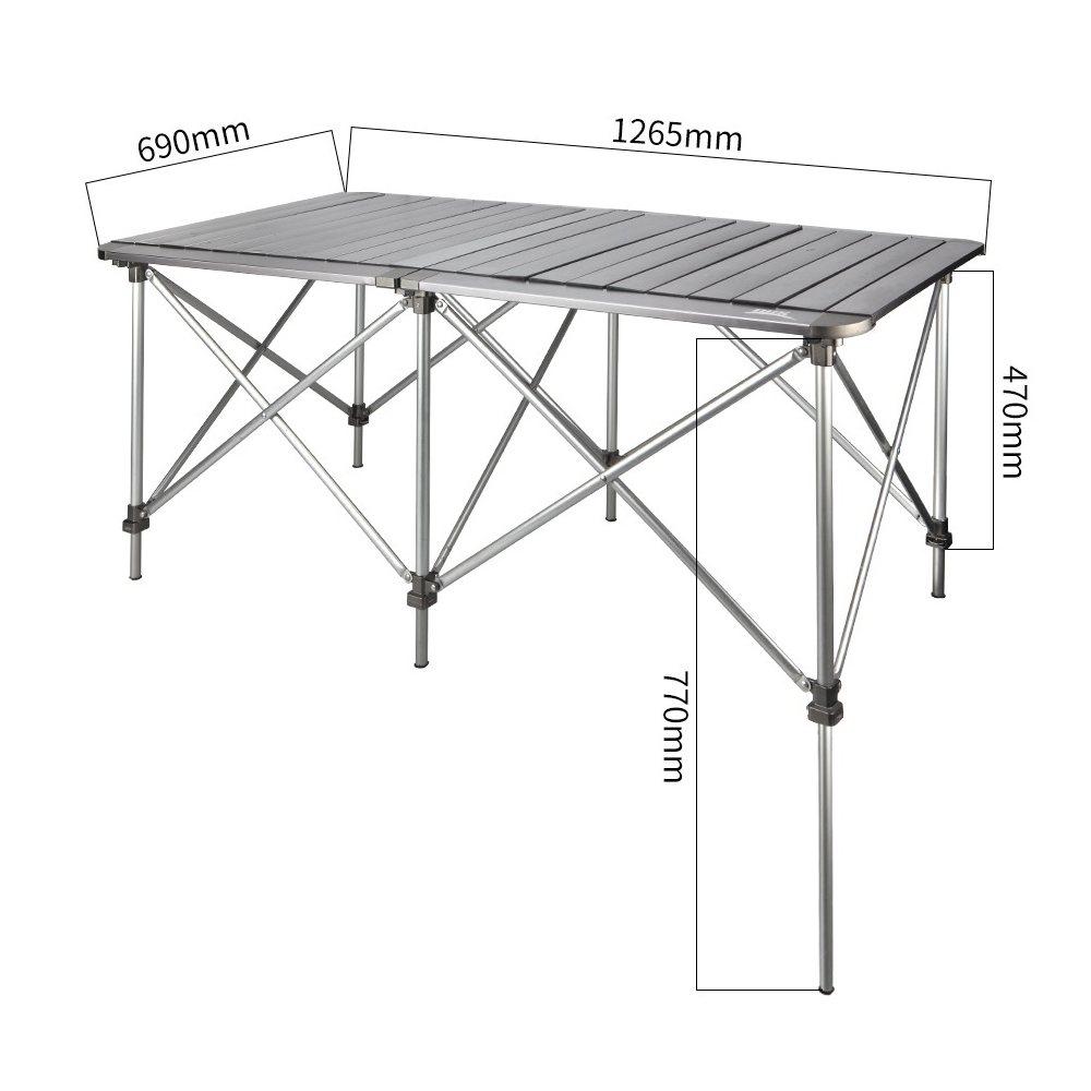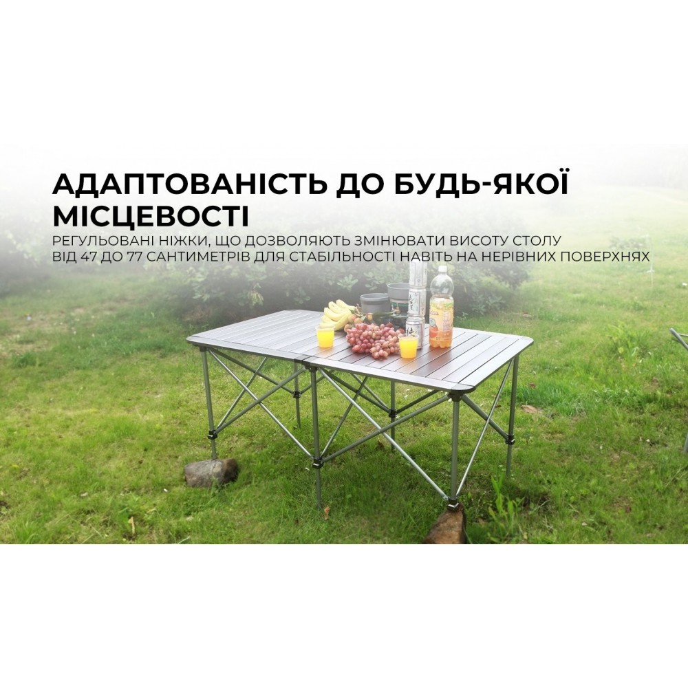 Столешница размером 126.5 х 69 сантиметров позволяет шести людям комфортно располагаться за столом. Для очистки достаточно просто протереть поверхность влажной тканью, чтобы удалить капли или остатки еды. В сложенном состоянии его размеры уменьшаются до 73 х 25 сантиметров. В комплект входит чехол, что значительно облегчает транспортировку и защищает металлические поверхности от царапин. Вес этого стола составляет 6.7 килограммов.