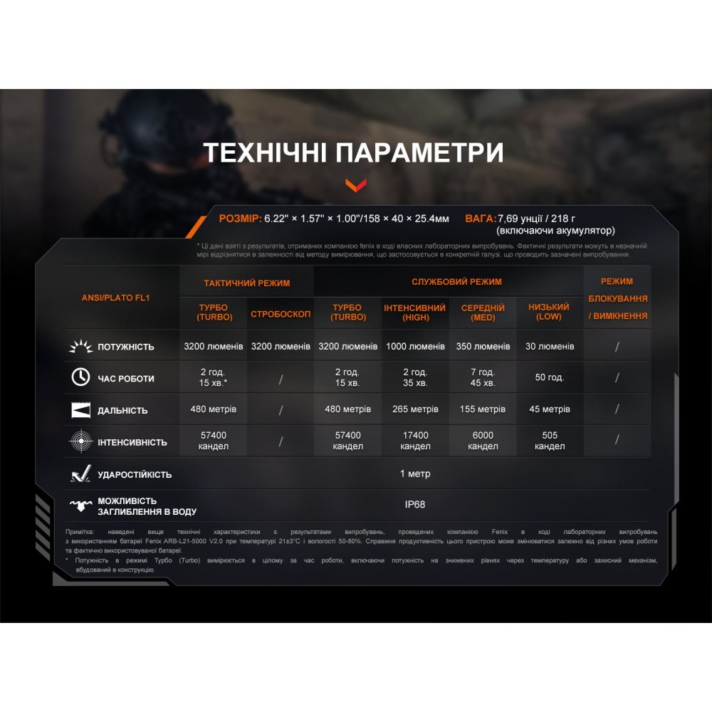Фонарь предлагает два набора режимов: тактический и служебный. Тактический набор включает турбо-режим и стробоскоп, оба со световым потоком 3200 люмен. Служебный набор предлагает турбо, высокий режим (1000 лм), средний (350 лм) и низкий (30 лм) для разнообразного применения. Стробоскоп может пригодиться для дезориентации или подачи сигналов.
