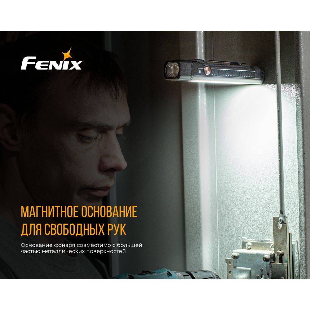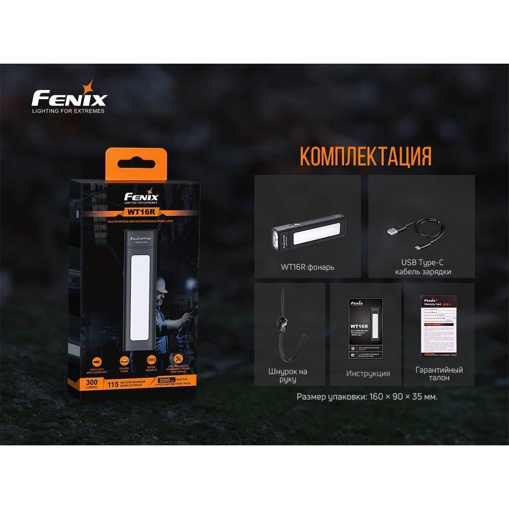 Фонарь модели Fenix WT16R, кабель для зарядки USB Type-C, ремешок на руку, инструкция по работе с фонарем, талон гарантии.