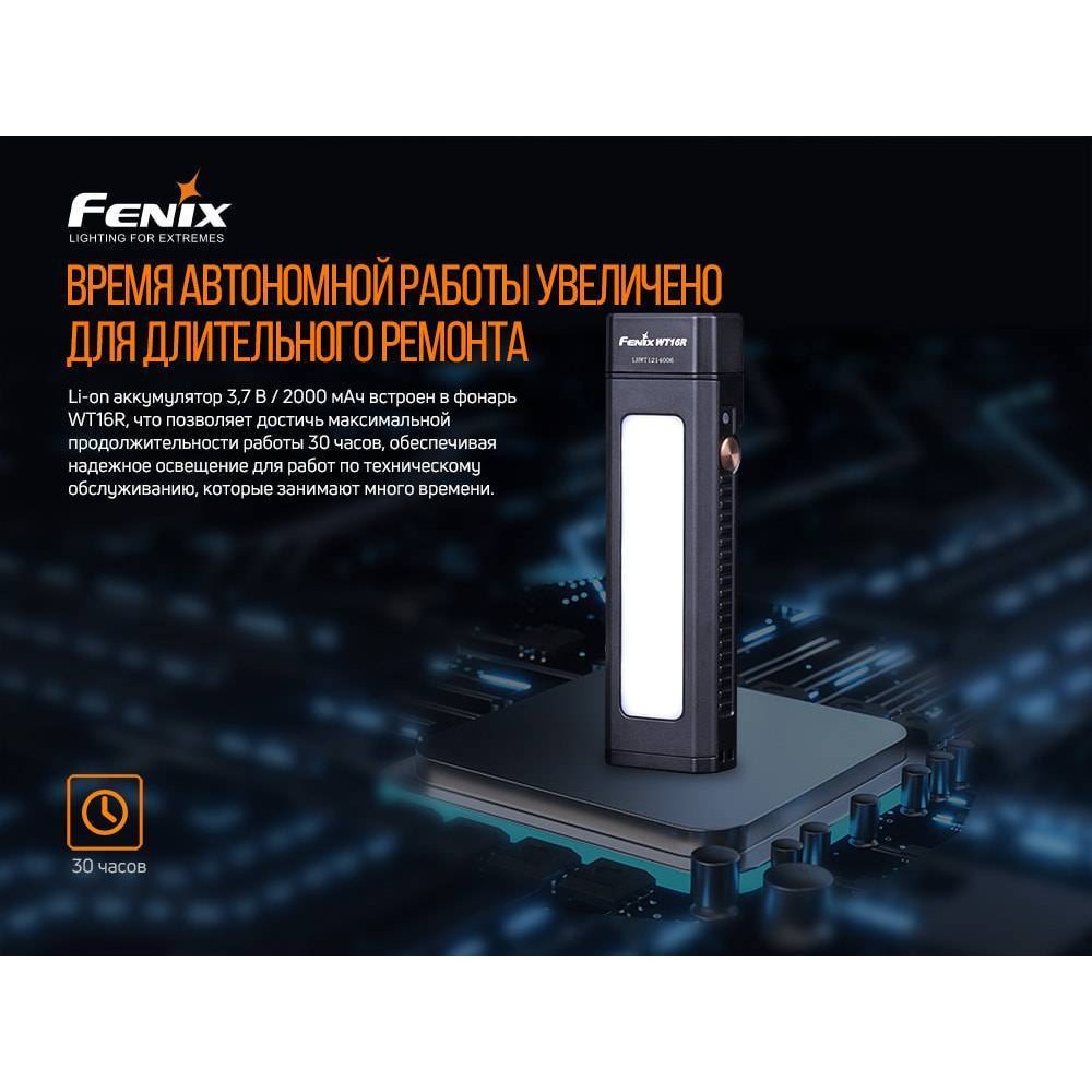 Модель Fenix WT16R является фонарем с множеством функций, и светит он с встроенным литий-полимерным аккумулятором. Обеспечивает качественное ближнее и дальнее освещение, а небольшой по размерам корпус очень удобен в руке. Максимальная яркость - 300 люменов, дальность освещения - 115 метров. Способен проработать без подзарядки до 30 часов. Для пользователя доступны шесть режимов освещения в фонаре.