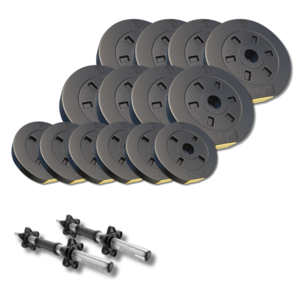 В комплекте 6 дисков по 1,25 кг и 8 дисков по 2,5 кг - это позволяет быстро менять нагрузку и симметрично настраивать вес для обеих рук. Диски удобны для базовых и изолирующих упражнений, а также для постепенного прогресса в тренировках.