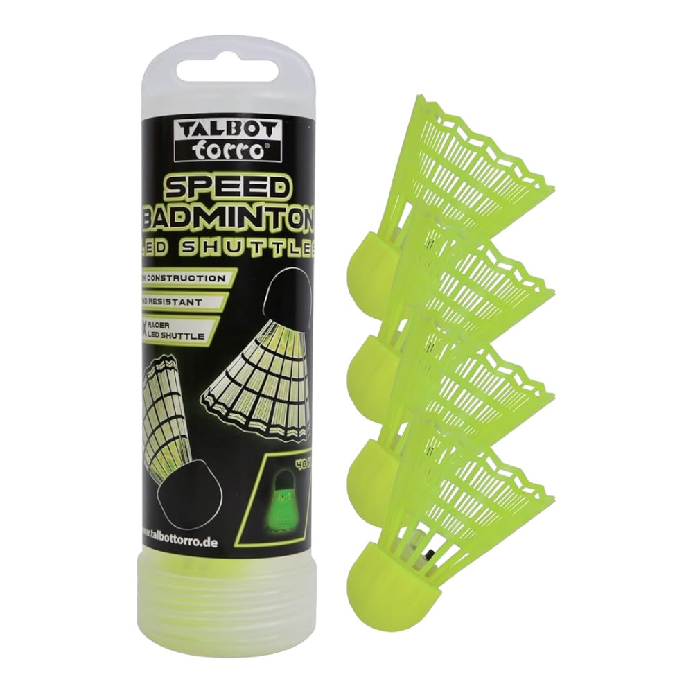 Туба с четырьмя высококачественными светодиодными воланами для бадминтона. Желтая головка, желтое перо, зеленый светодиод. Светодиодная подсветка активируется ползунковым переключателем на головке волана, обеспечивая освещение примерно на 48 часов.