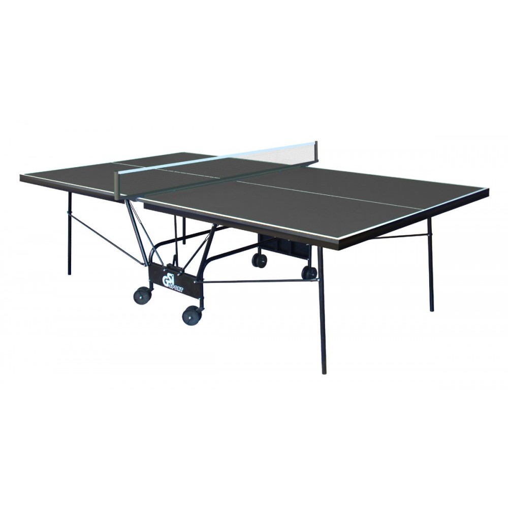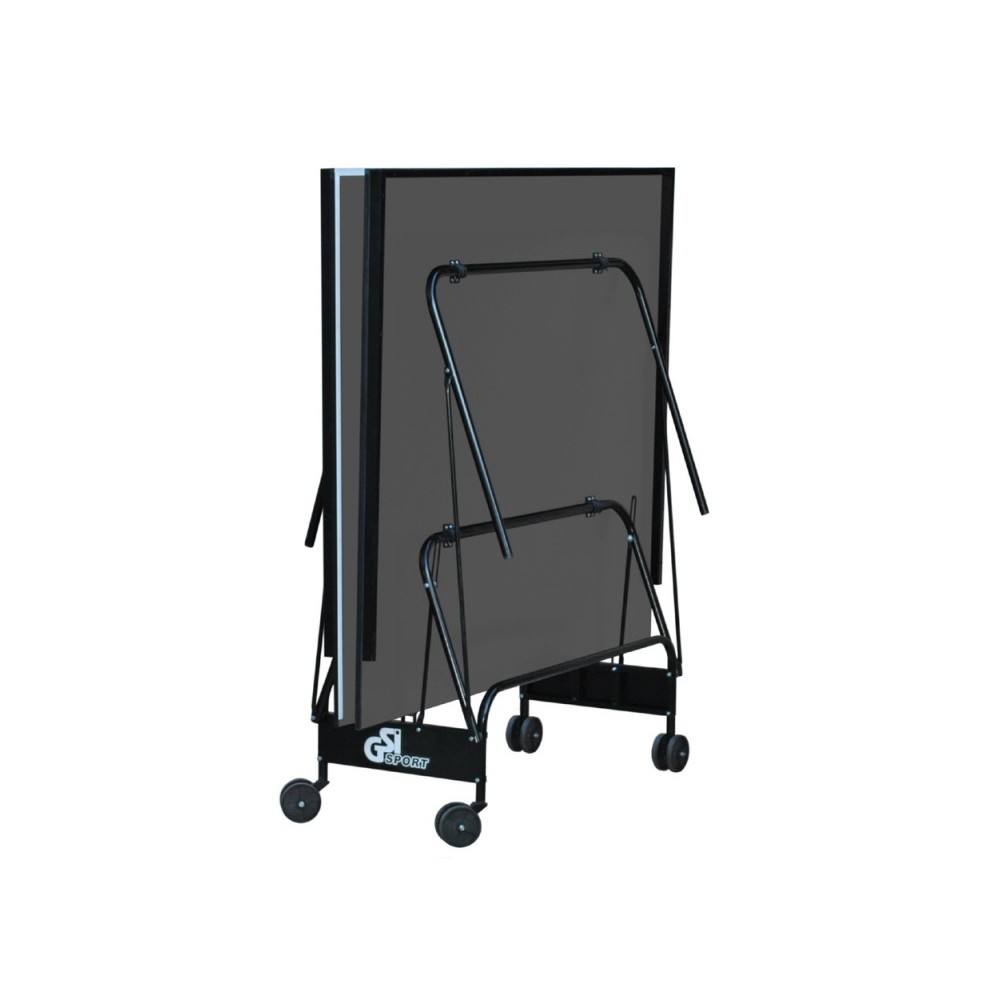 Тенісний стіл GSI-Sport Compact Strong у графітовому кольорі призначений для використання в закритих приміщеннях. Ігрова поверхня виготовлена з спеціально обробленої древесностружечної плити (ДСП), товщина якої дорівнює 16 мм. На ДСП нанесено особливе антиблікове пластикове покриття кольору графіт. Металева рама з прямокутним профілем розміром 30 на 20 мм забезпечує додаткову стабільність. Стіл встановлено на зручному компактному візку, виготовленому з металевого трубчастого профілю діаметром 25 мм, покритого поліефіром. Конструкція столу дозволяє тренуватися самостійно. Переміщення столу легке завдяки 4 здвоєним колесам діаметром 107 мм, з яких 2 є маневреними. Комплектується сіткою.
