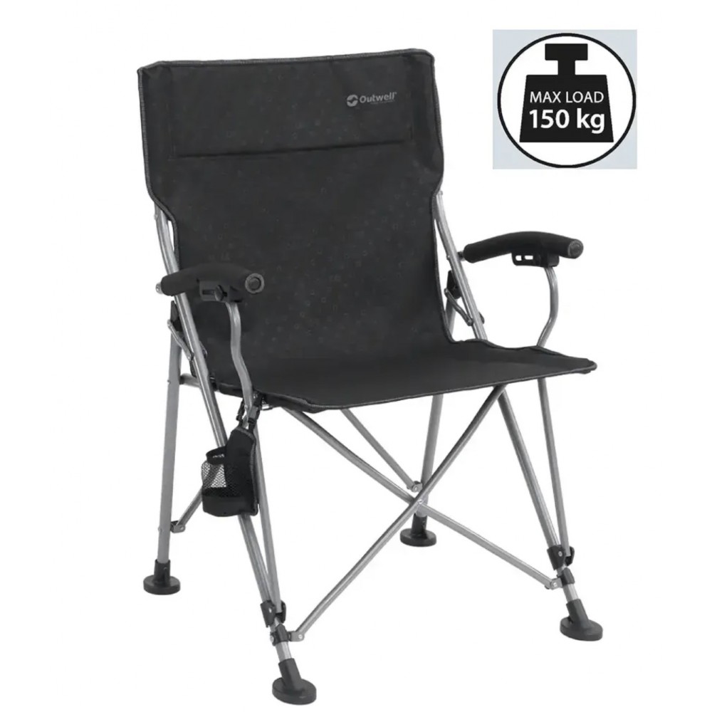 Outwell Campo Black (470233) - це складаний стілець з м'якими підлокітниками і відокремлюваним підстаканником. Він оснащений каркасом з високоякісної сталі, який має порошкове покриття, та витримує вагу до 150 кг. Широкі опори ніжок забезпечують стабільність на м'яких поверхнях. У комплекті є чохол для зручного транспортування та компактного зберігання, коли стілець не використовується.